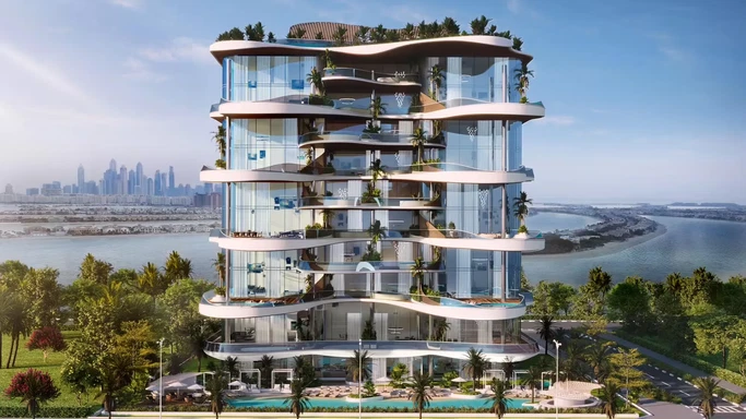 Its wave-shaped front is made up of large patios with private pools, glass walls that let in lots of light, and light-colored pillars. This building fits right in with the lush greenery around it and the water in the Persian Gulf shows it off beautifully. The roof and balconies of this high-end building will be decorated with many plants that look nice.